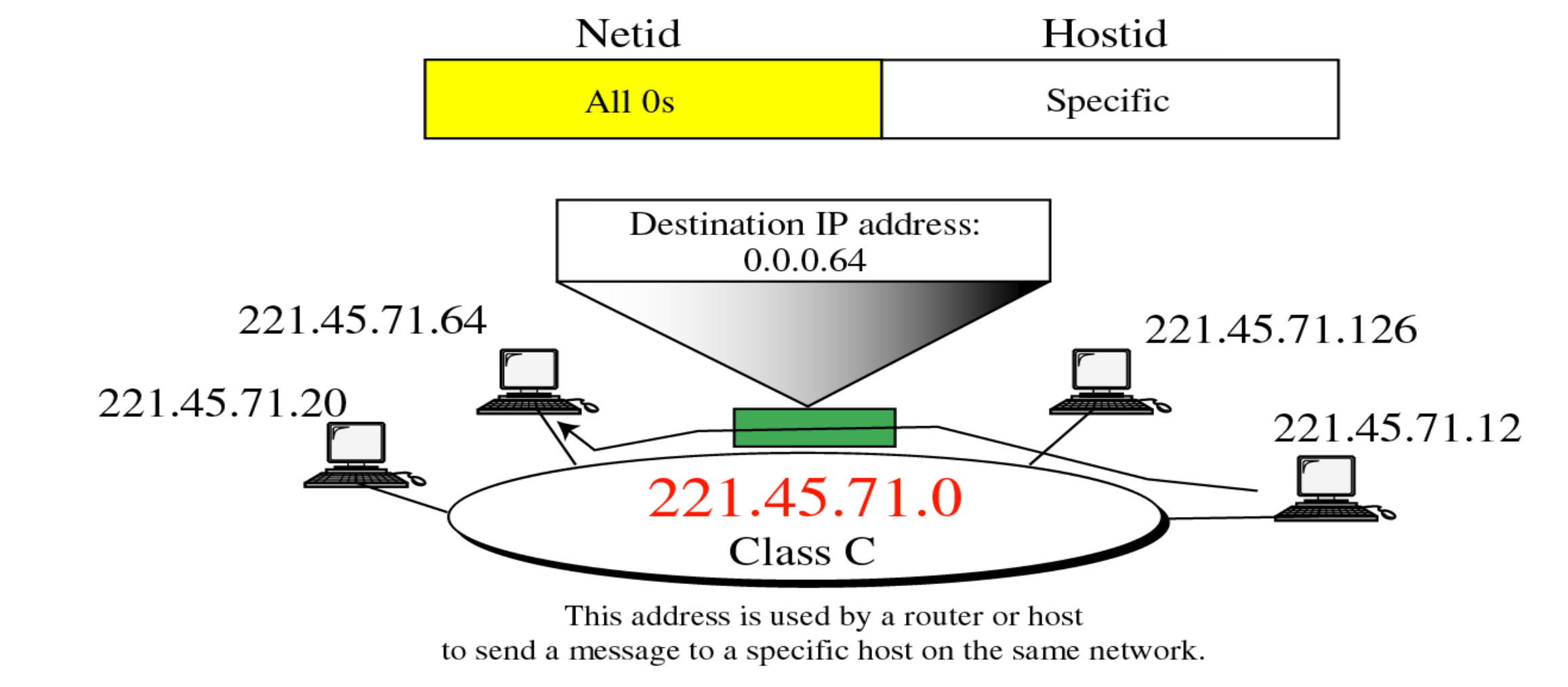 이번에는 Netid가 전부 0인 주소이다. 이 주소는 패킷을 보내는 호스트가 속해있는 네트워크 안에서의 호스트를 가리킬 수 있다. 즉, 내가 속한 네트워크 내의 다른 호스트에게 메시지를 보낼 때 사용하는 IP이다.