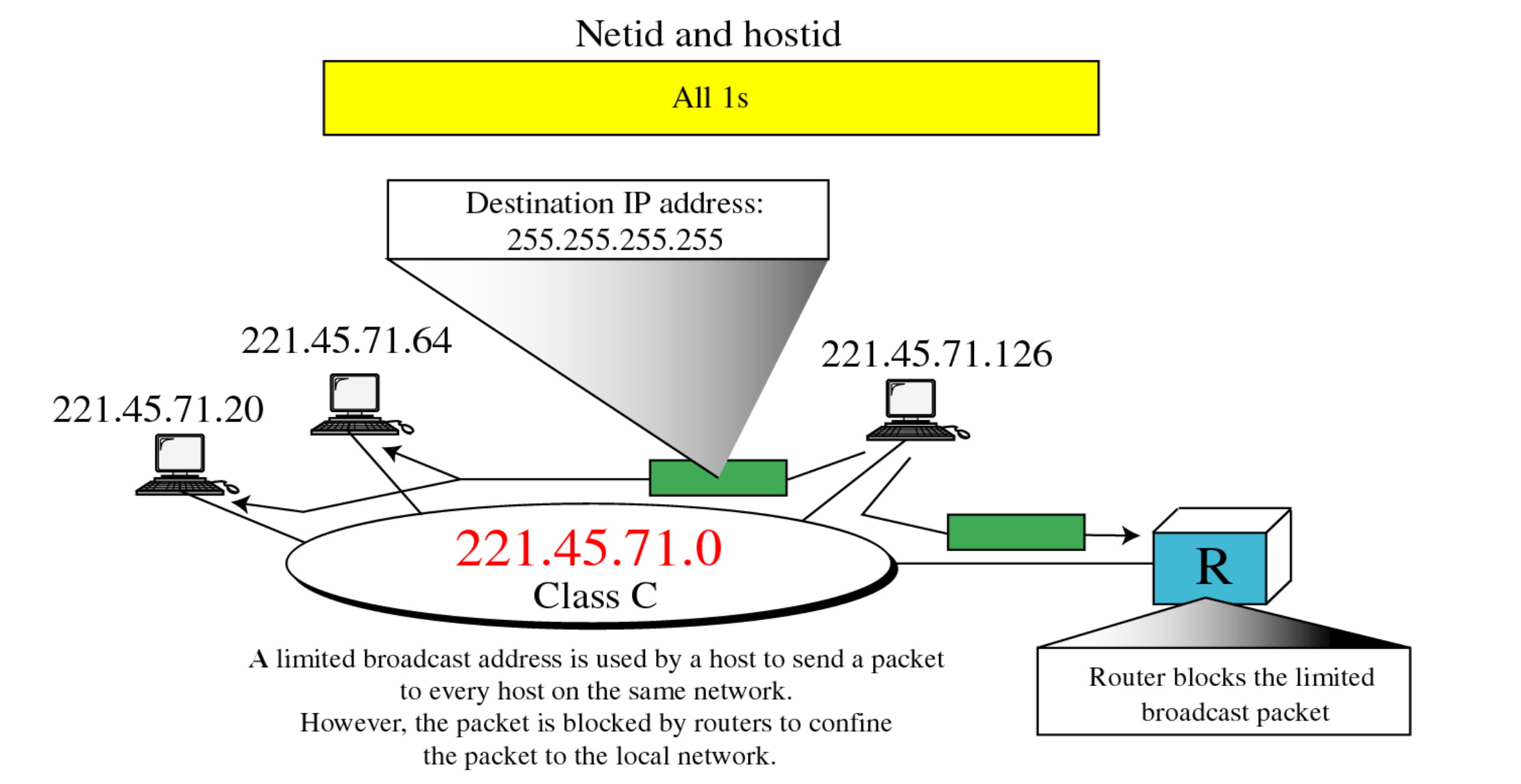이건 Netid와 Hostid 모두 1로 이루어진 주소이다. 이것 역시 broadcast address이기 때문에 특정 네트워크의 모든 호스트를 지칭하지만, Direct broadcast address와 달리 Limited broadcast address는 패킷을 보내는 호스트가 속해있는 네트워크 내의 전체 host를 지칭한다. 즉, 내가 속한 네트워크의 모든 호스트들에게 메시지를 보내고자 할 때 사용한다.
