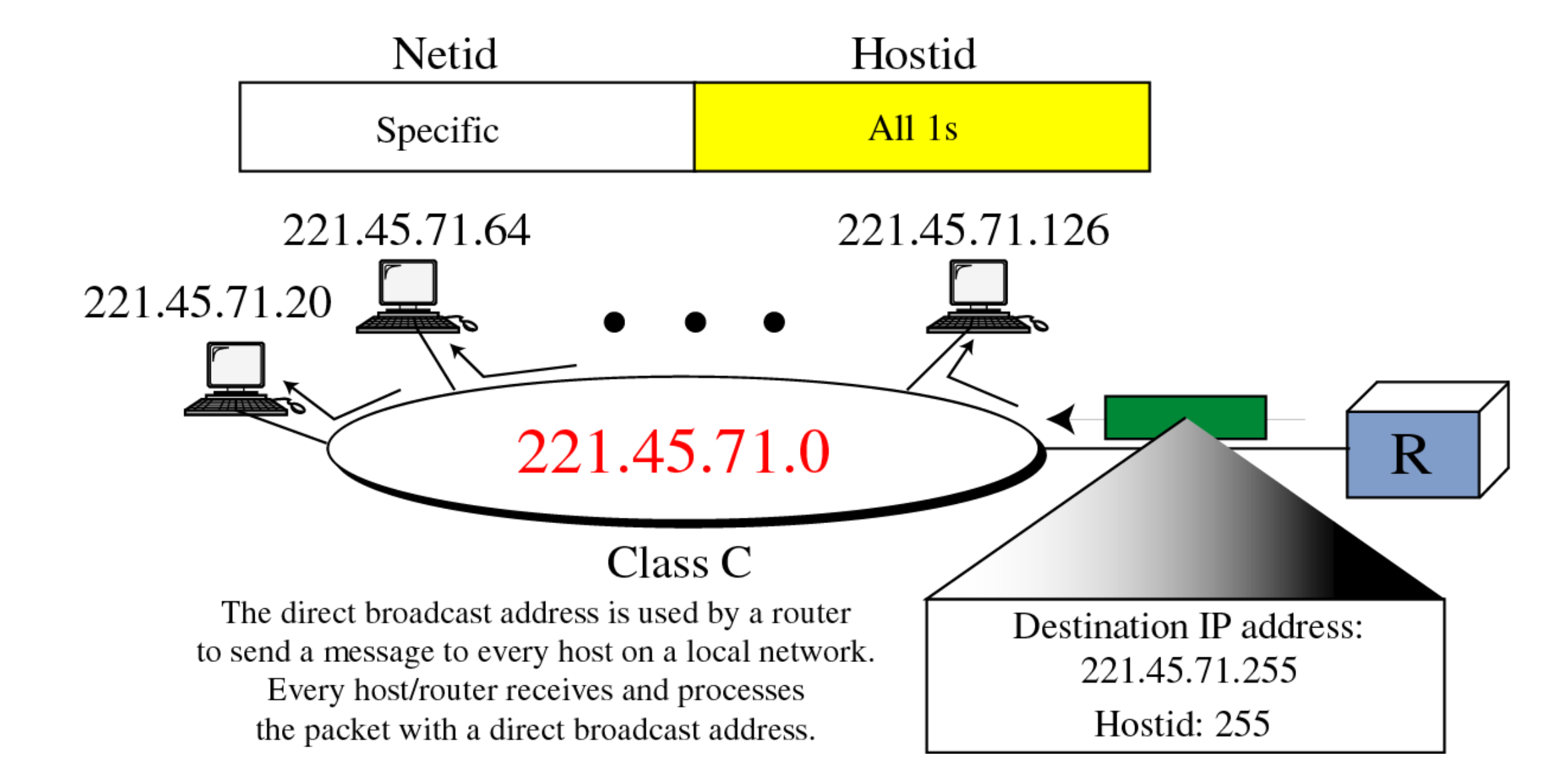 Direct broadcast address는 Hostid를 전부 1로 설정하는 주소이다. 이 주소는 특정 네트워크에 있는 모든 host들에게 패킷을 보낼 때 사용된다. 이 역시 특정 네트워크에 있는 모든 호스트들을 지칭하는 주소이기 때문에 특정 호스트에게 할당할 수 없다.