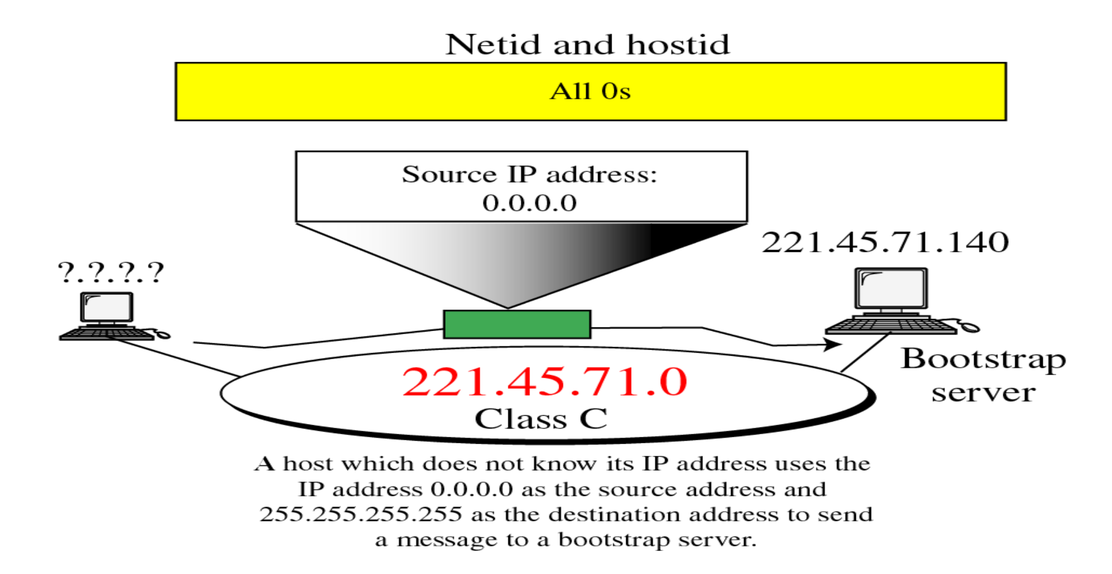 Limited broadcast address와 반대로 Netid와 Hostid 모두 0으로 이루어진 주소이다. 이 IP는 특이하게 Source address로만 사용되는 IP이다. 이 주소는 IP를 할당받기 전에 짧은 시간 동안 임시로 사용하는 주소이다. 이렇게만 말하면 어려우니 예를 통해 이해해보자.