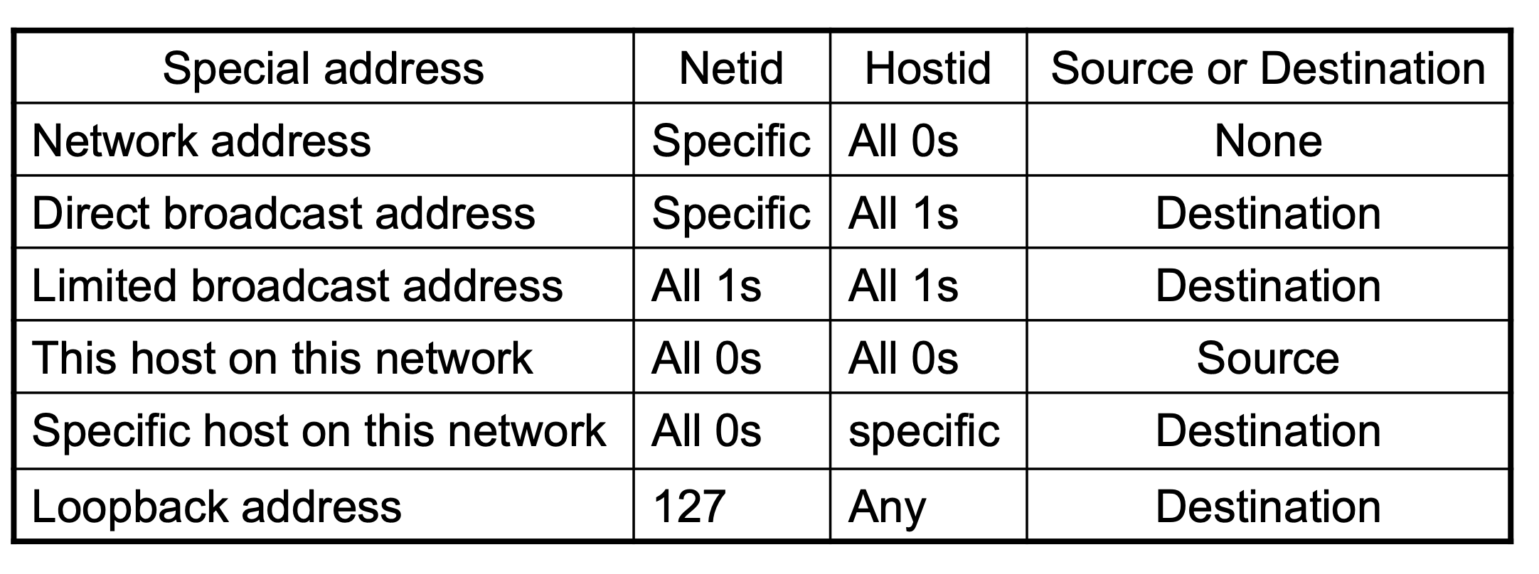 한편, Netid만 모두 0으로 만들고 hostid는 특정 호스트를 지정하는 Specific host on this network가 있었고 Netid 첫 8비트를(Dotted Decimal Address에서 첫 자리를) 127로 사용하는 Loopback address가 있었다.