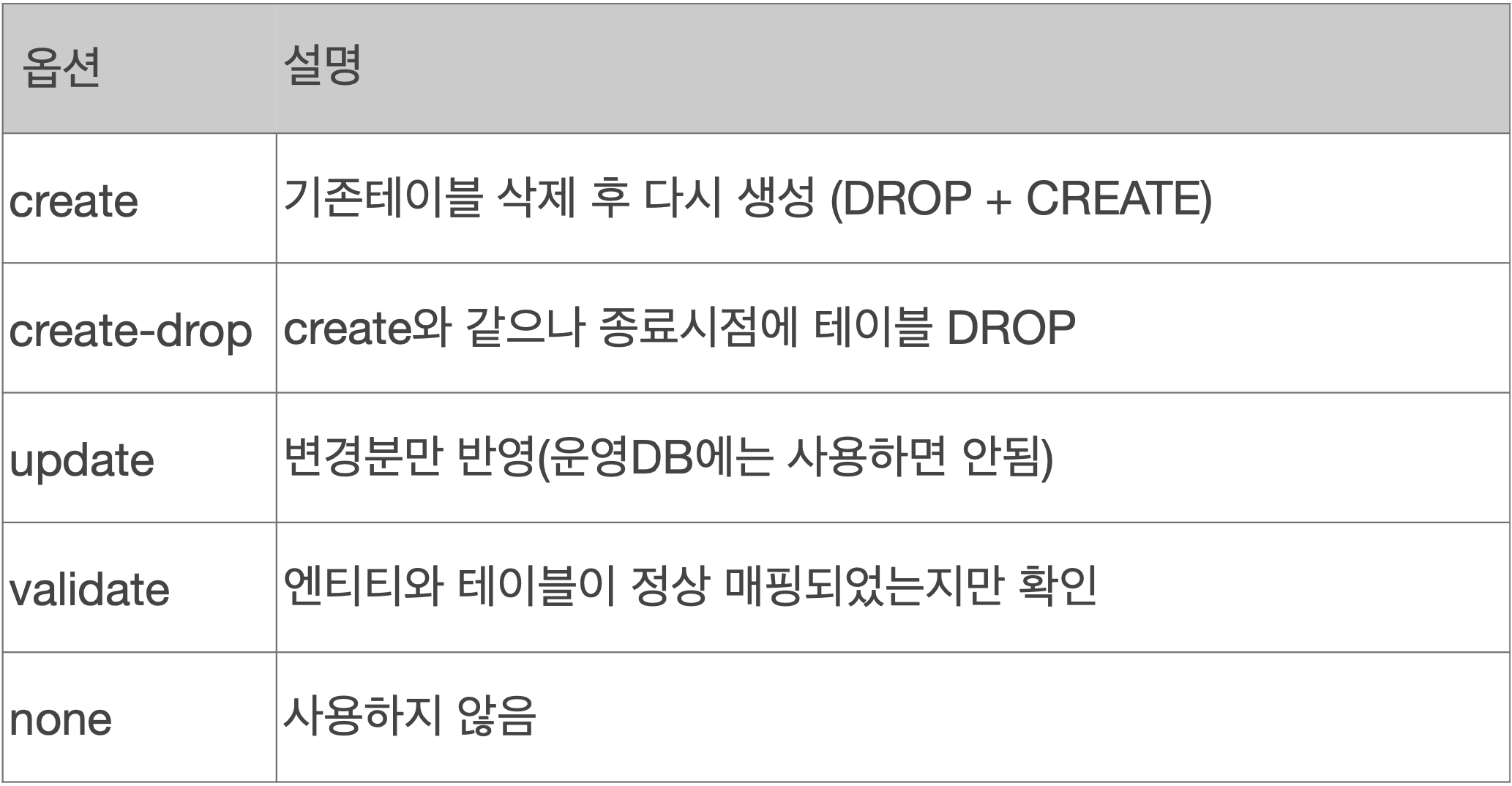 스프링에서는 application.properties에 spring.jpa.hibernate.ddl-auto에서 설정 가능하다.