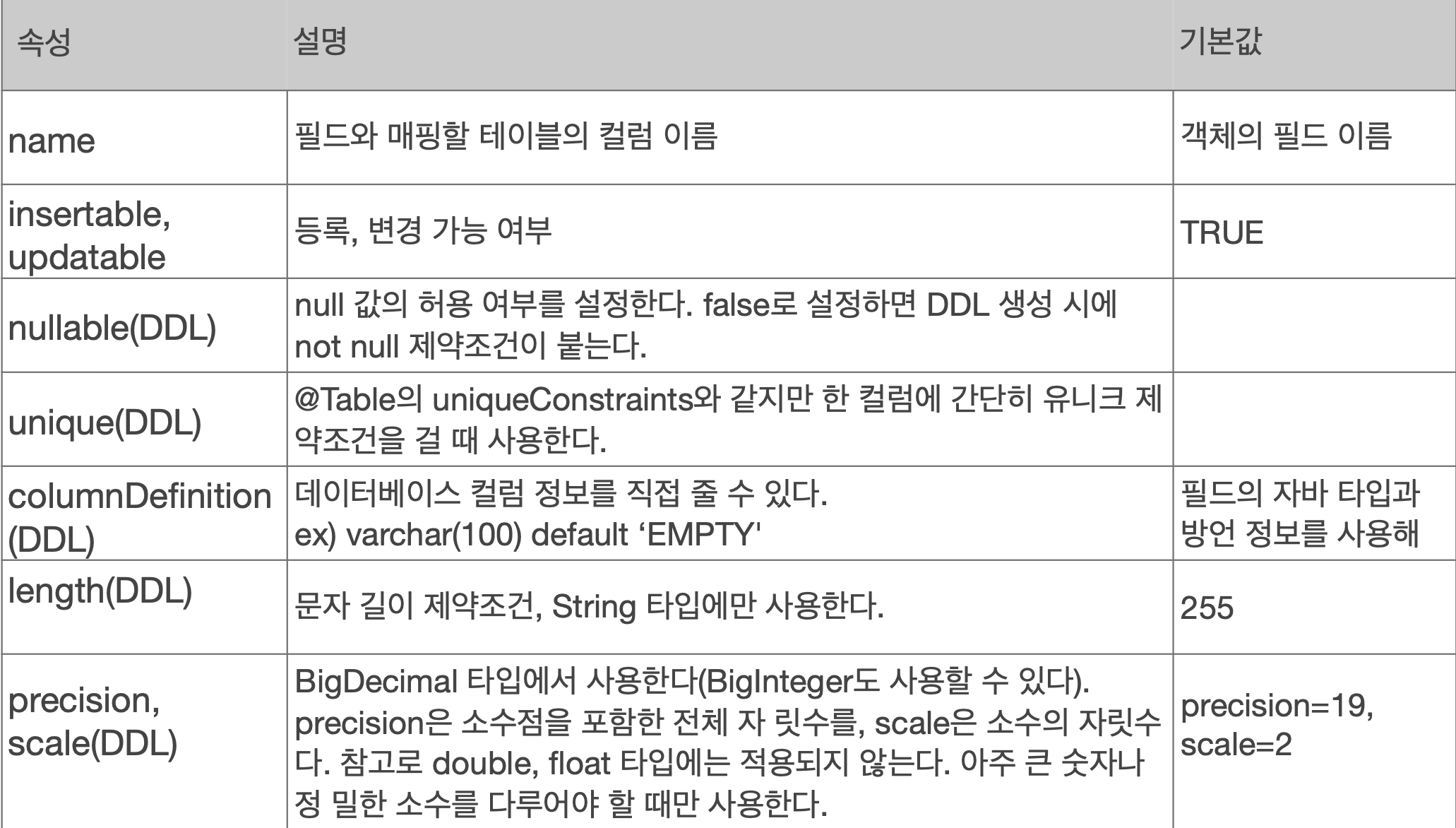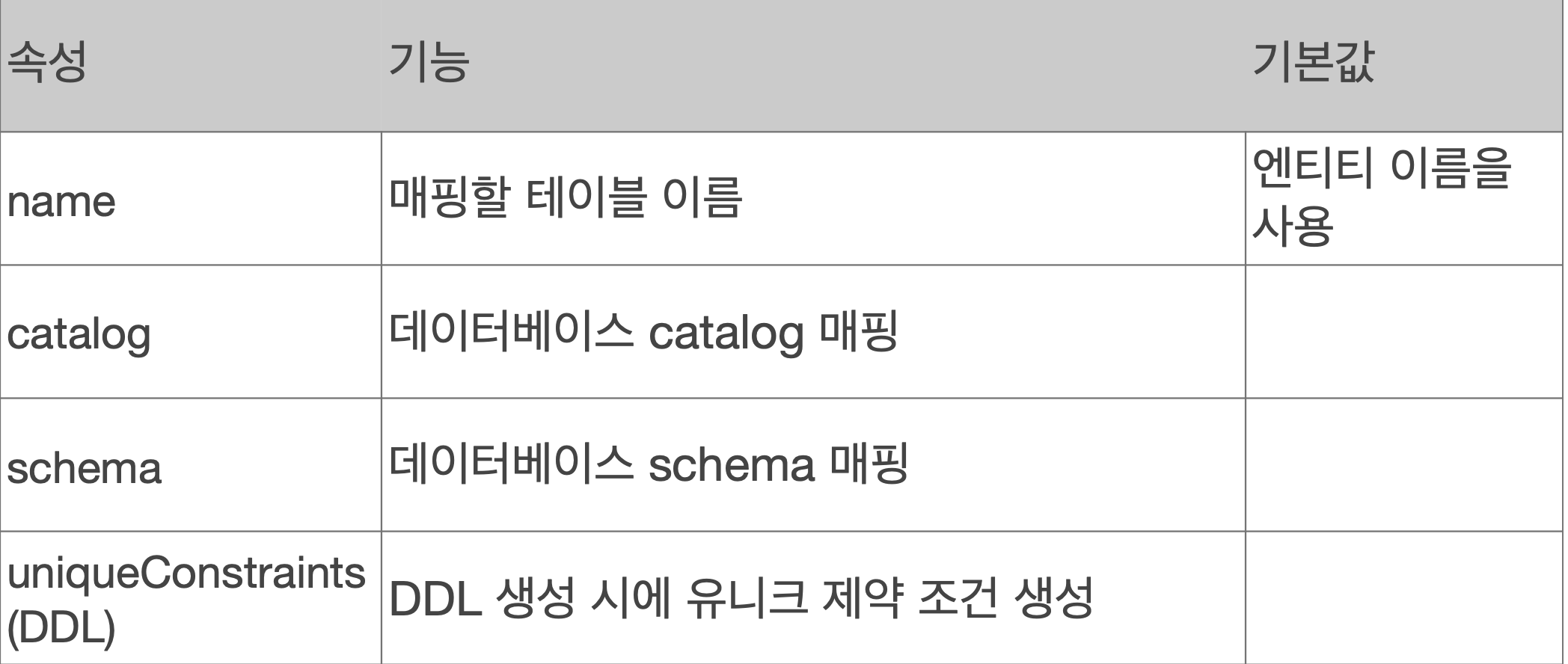 주로 name 속성을 알아두면 되는데, 기본적으로는 엔티티의 이름을 사용하여 생략이 가능하지만, 엔티티의 이름과 다른 테이블 명을 사용하고 있다면 @Table(name="name")으로 테이블 명을 지정해주어야 매핑이 가능하다.