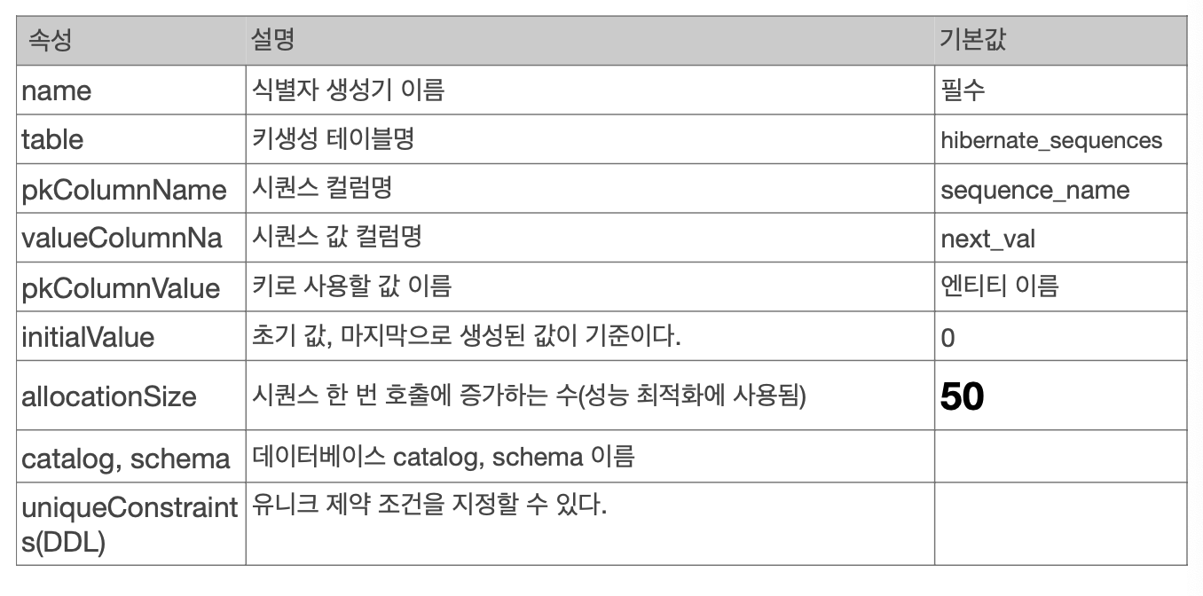 pkColumnValue = “MEMBER_SEQ", allocationSize = 1)