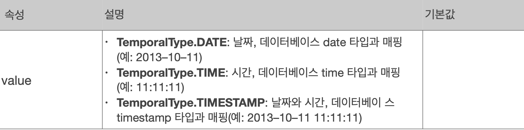 날짜 타입을 매핑할 때 사용한다. 이때, LocalDate(연월), LocalDateTime(연월일)을 사용할 때는 생략이 가능하다.