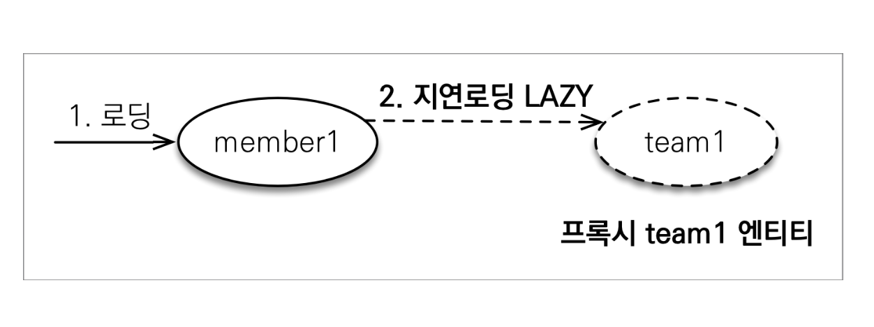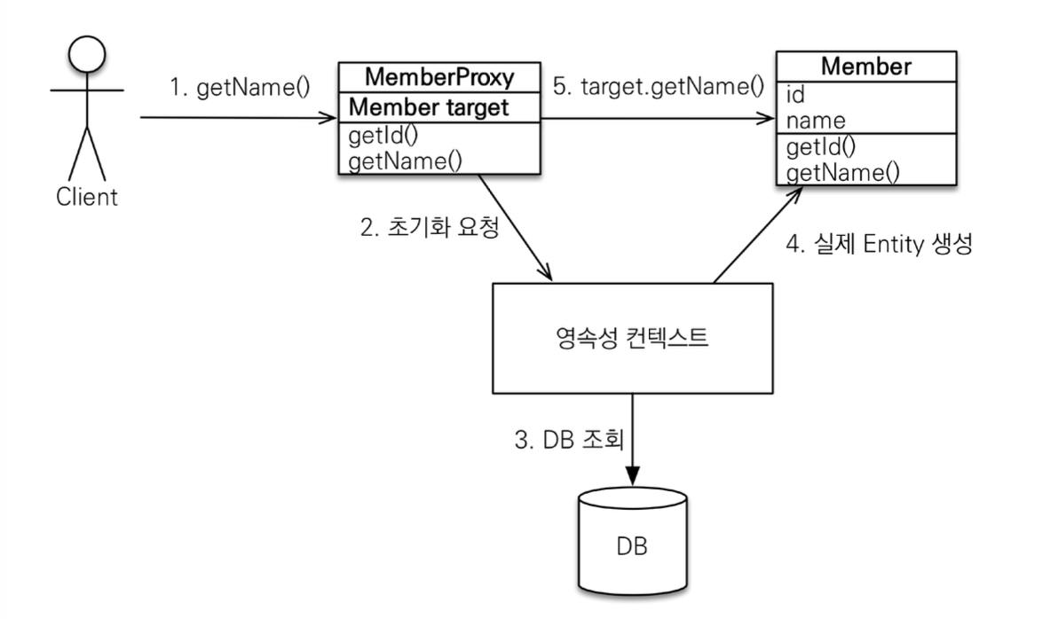 Member 객체가 Team 객체에 의존하고 있다고 해보자. 이때, Member를 조회한다면 Team도 함께 조회해야 할까? Member를 조회해서 Team을 사용하지 않을 경우에도 Team 객체를 조회하는 것은 비효율적인 방법이다. 기존에는 em.find를 하면 해당 객체에 맞는 엔티티를 DB에서 실제로 조회해서 가져왔는데, em.getReference()를 이용해서 객체를 가져오면 DB에서 조회하는 것을 미루고 가짜 엔티티를 가져온다. 여기서의 가짜 엔티티를 Proxy라고 한다.