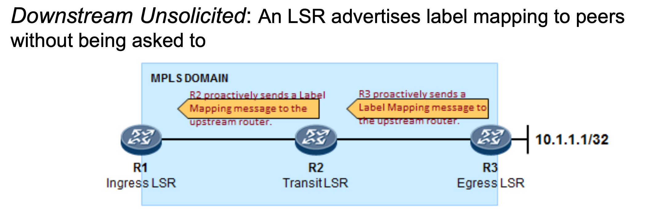 또한, MPLS에서는 Downstream(Destination Address쪽 LER)에서 Upstream(Source Address쪽 LER)방향으로 setup 과정이 이루어진다. Downstream이 주변 인접 라우터들에게 "A로 패킷을 보내고 싶으면 ID를 10으로 해서 보내줘"와 같이 Label에 대한 정보를 Broadcast하는 식으로 프로토콜이 동작한다.