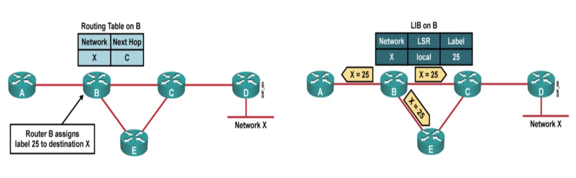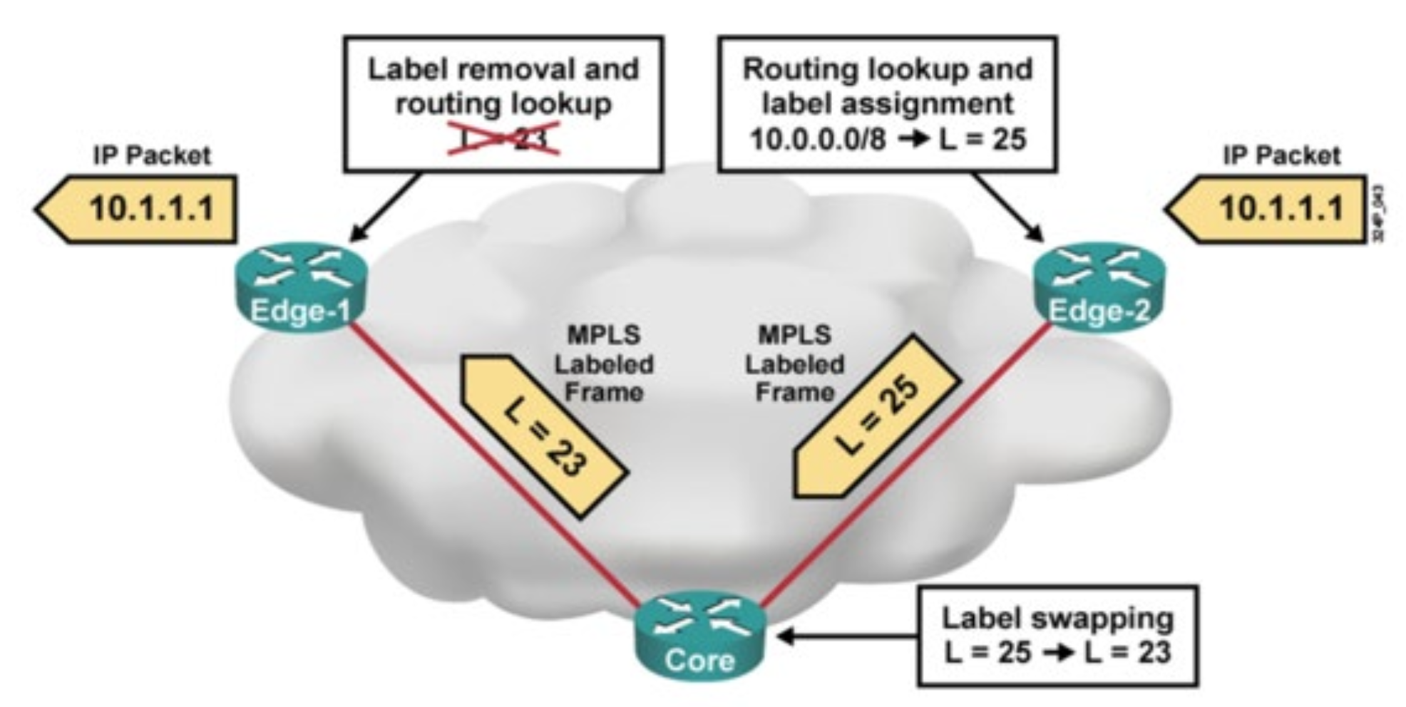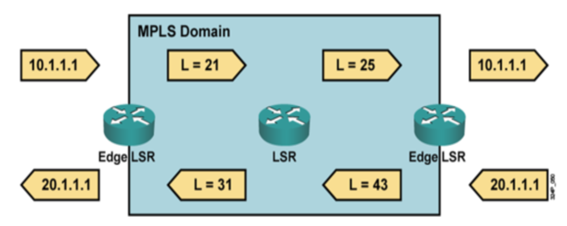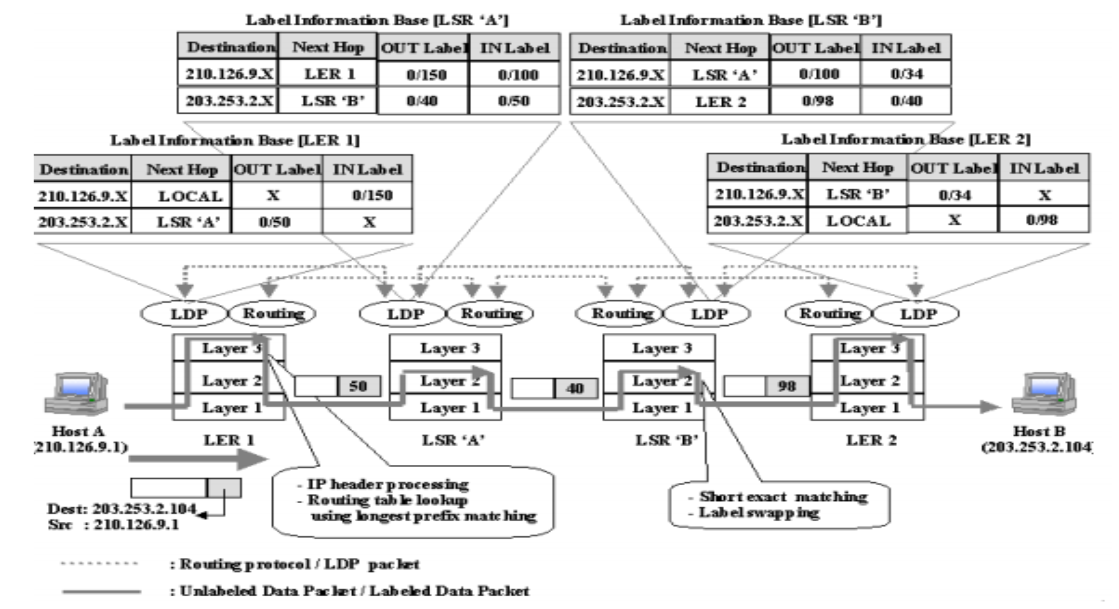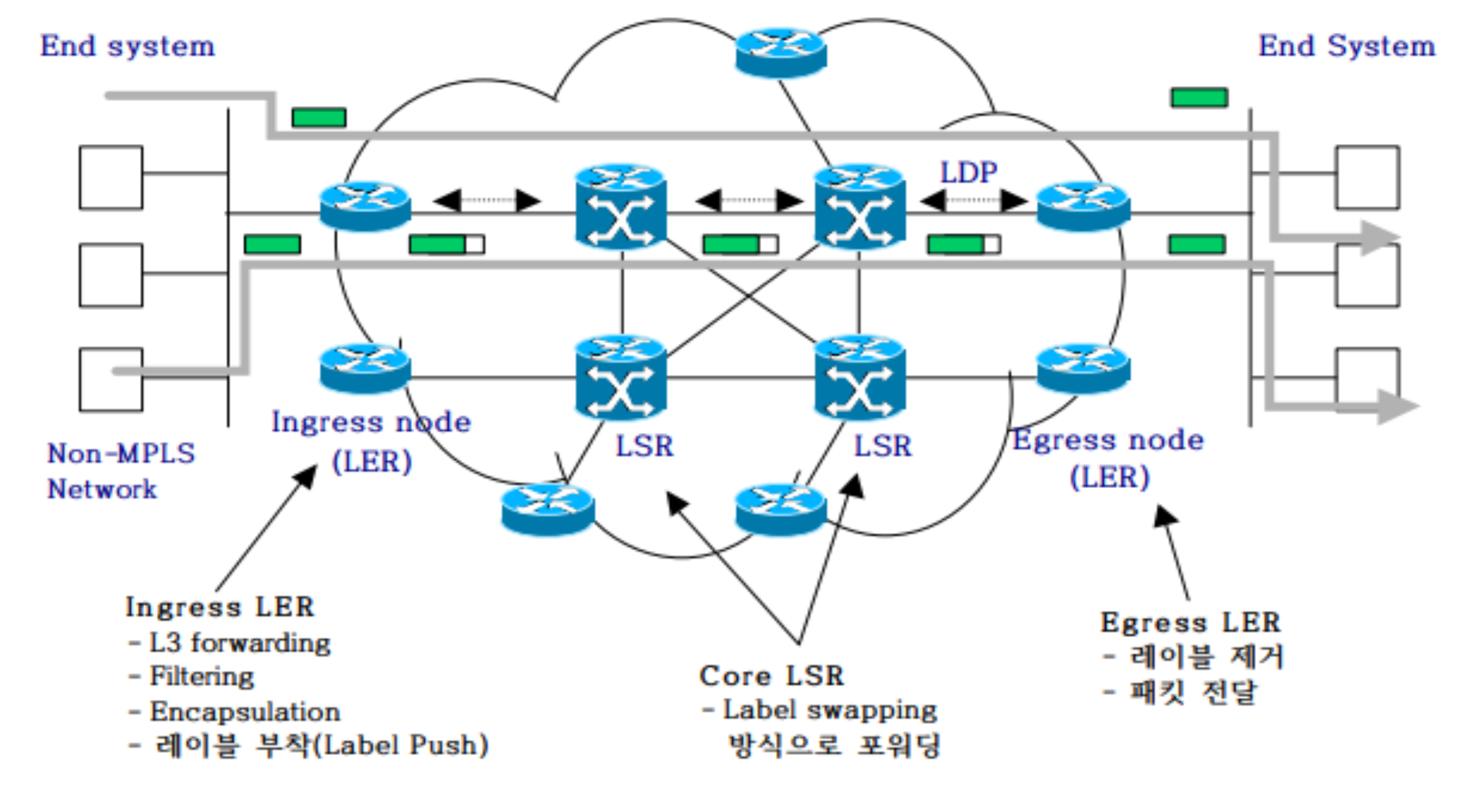 이 Label을 보고 패킷을 전달할 수 있는 라우터를 LSR, Label switched router라고 하고, Host와 연결된 끝 라우터를 LER이라고 한다. LER에 패킷이 들어오면 여기서는 패킷에 Label을 부착하거나 제거하는 역할을 하고, LSR은 이제 이 Label만 보고 들어온 패킷을 라우팅시키면 된다.