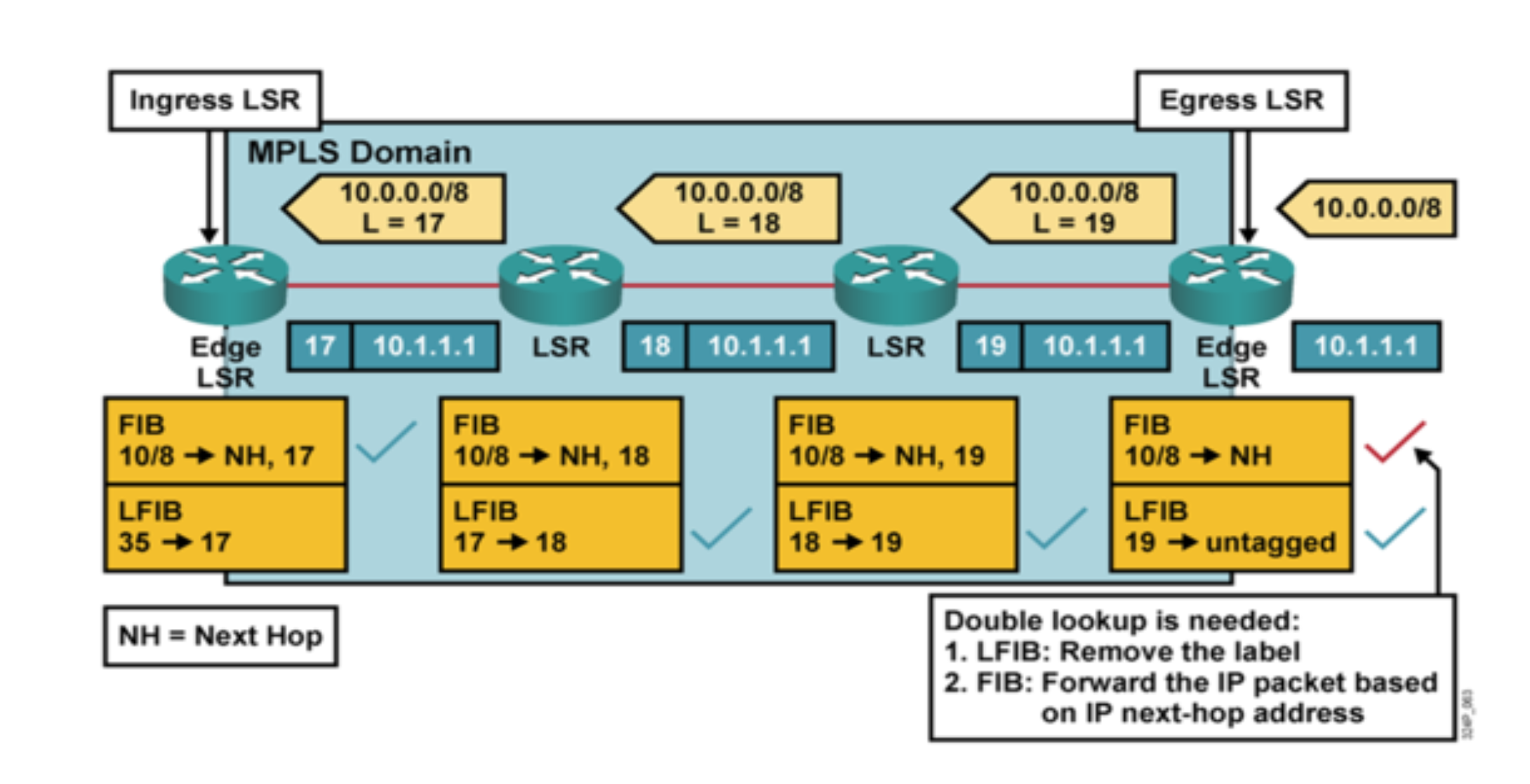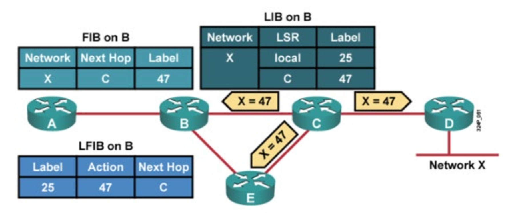 LSR은 이 메시지를 수신하여 LIB와 LFIB를 만들게 된다. LIB는 자신이 가지고 있는 모든 라벨 정보들을 모아둔 것이고, LFIB는 이 LIB를 기반으로 어떤 액션을 취해야 하는 지를 정의한 테이블이다.