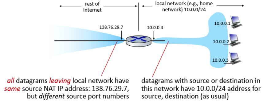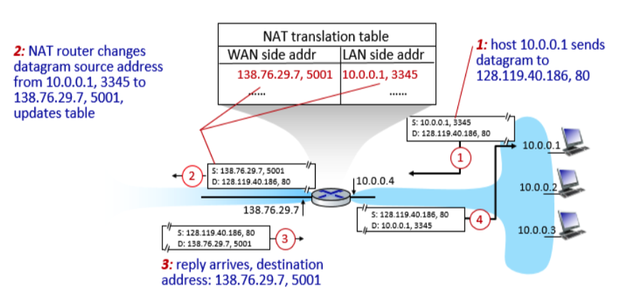 이에 대해 외부에서 10.0.0.1:3345로 응답을 주고 싶다면 138.76.29.7:5001을 Destination address로 설정해서 패킷을 보내면 NAT가 다시 NAPT 작업을 통해 10.0.0.1:3345로 Destination address를 변환하고 Private network 안에서 데이터를 전달할 수 있게 된다.