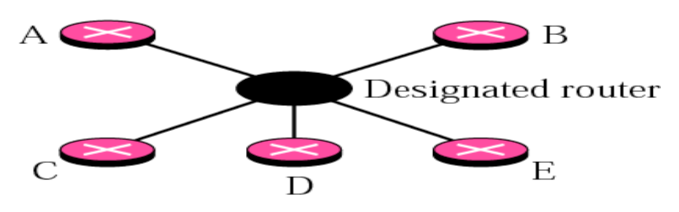 실제 라우터는 아니지만, 논리적으로 라우터가 하나 있다고 가정해서 본다면 Transient 구조에서 Neighbor 라우터가 너무 많아지는 문제를 해결할 수 있다. 이 논리적인 라우터는 실제로 존재하는 라우터가 아닌 논리적인 개념이기 때문에, 실제 라우터 중 한 라우터가 이 역할을 대신해준다. 이 역할을 하는 라우터를 Designated router라고 한다.