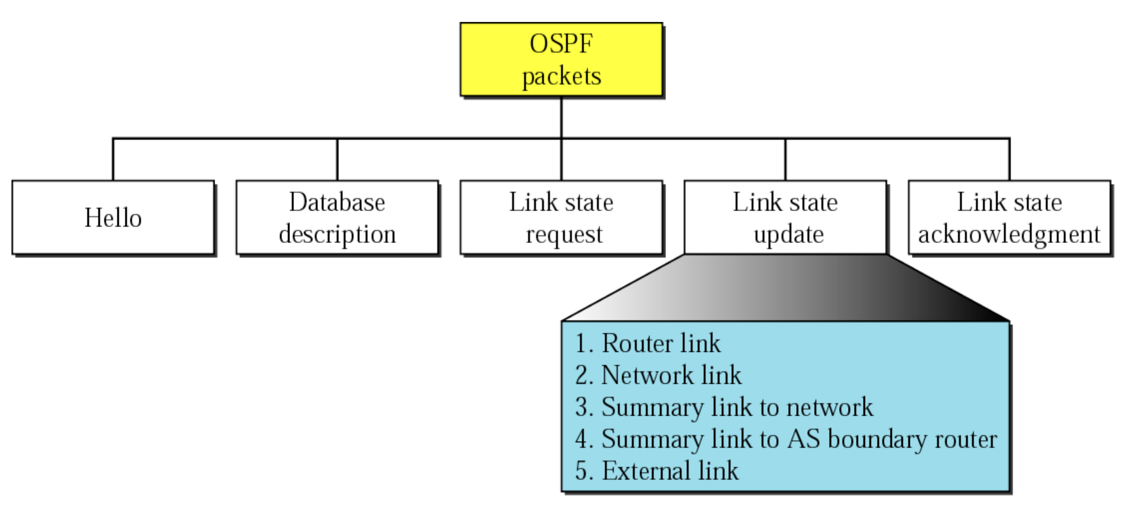 LSR에서는 라우터들 간 Hello 메시지 교환이 끝나면, 이 정보들을 모아 다른 라우터들에게 Broadcast 시킨다고 했다. 여기서 라우터가 자신의 인접 라우터와의 관계를 정의하는 것을 LSA, Link state advertisement라고 하고, 이 LSA들을 모아 다른 라우터들에게 보내는 패킷을 Link state update packet이라고 한다.
