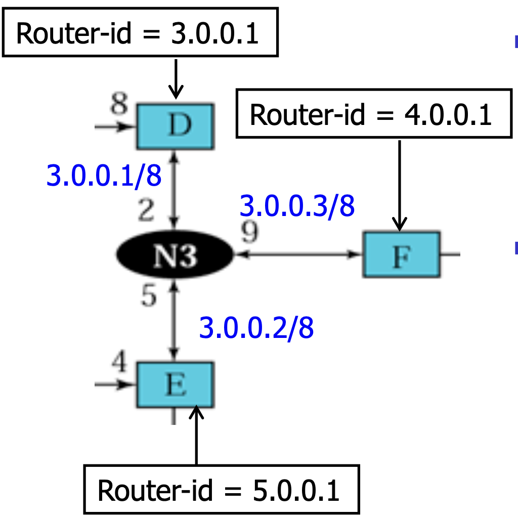 이 그림에서는 E의 Router ID가 가장 크기 때문에 E가 Designated router가 된다. 주의해야 할 점은 이 Designated router는 논리적으로 라우터가 하나 더 있다고 생각하는 것이라고 했다. 그렇다면 이 논리적인 Designated router에도 Router ID가 필요하다. 이것을 Link ID라고 하는데, E의 Router ID를 그대로 사용하는 것이 아니라 Designated router 위치(N3 위치)에서 E와 연결된 인터페이스 주소, 즉 3.0.0.2가 Designated router의 Link ID가 된다. 이렇게 되면 DR의 Neighbor는 D, E, F이지만, 각 라우터들의 Neighbor은 ID를 3.0.0.2로 가지고, N3 위치에 있는 Designated router만 Neighbor 라우터로 존재할 수 있게 된다.
