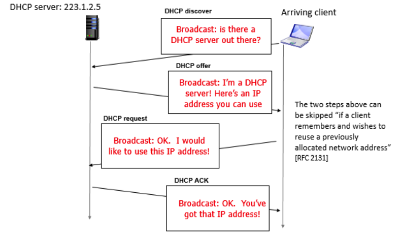 이런 DHCP는 RARP와 달리 IP주소, Mask값, first-hop router address(=Default gateway), DNS 주소 등을 한번에 알려줄 수 있다. 참고로 이 DHCP는 Application layer에서 사용하는 프로토콜이다.