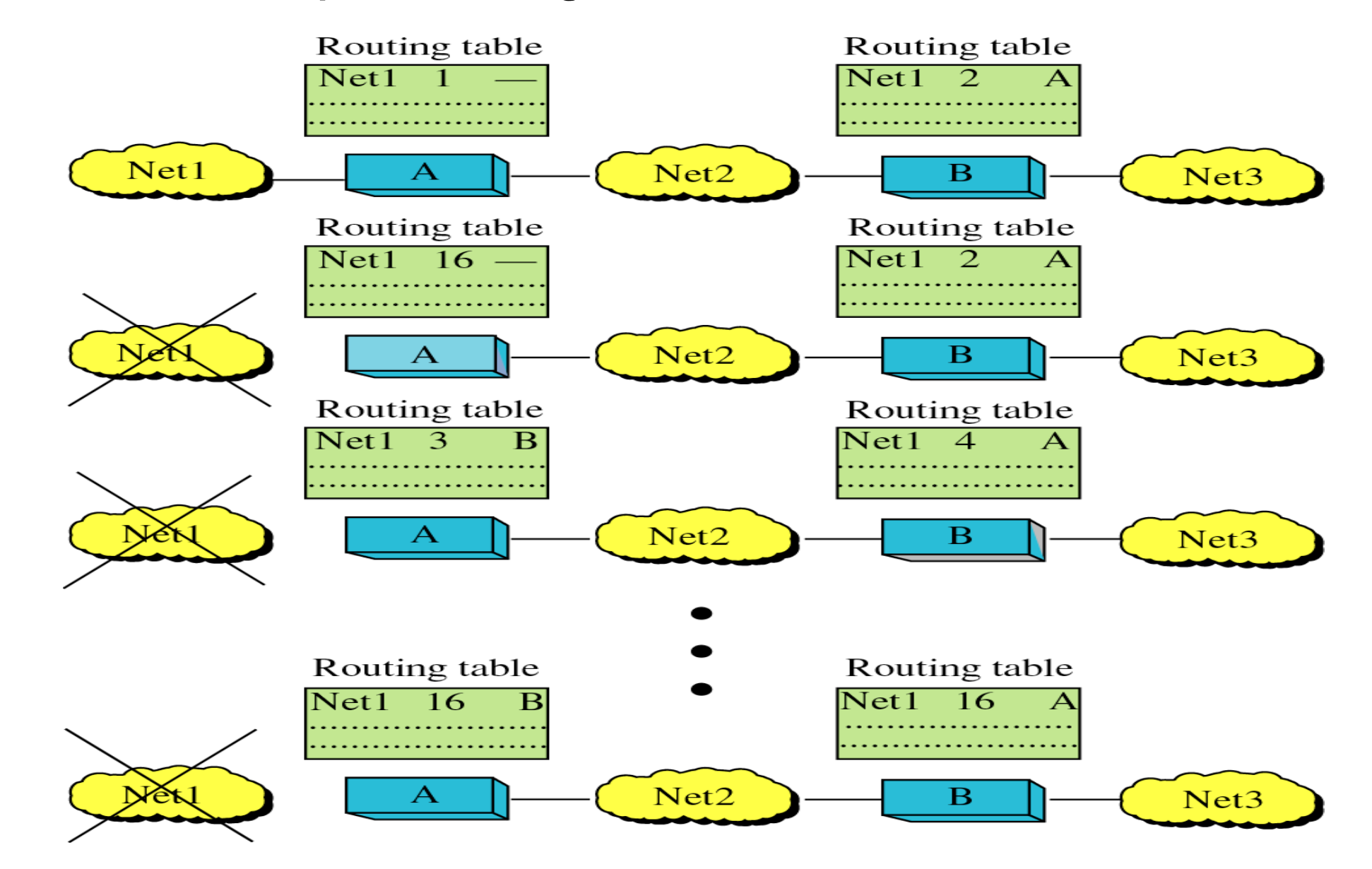 그러나, 이 상황에서 B라우터가 Net1으로 접근하지 못한다는 정보를 전달하는 A -> B 방향으로의 RIP 메시지보다 B -> A 방향으로의 RIP 메시지가 먼저 A 라우터에게 도착한다면, A 라우터는 B로부터 들어온 RIP 메시지를 받아 기존 정보를 교체하게 되는 문제가 발생한다.