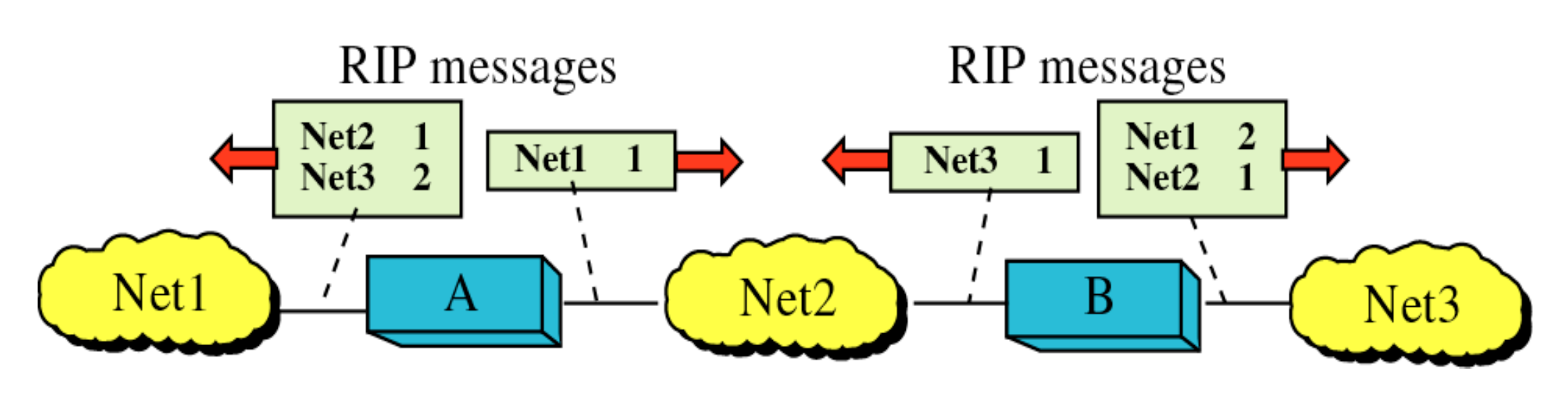 이렇게 만들어진 라우팅 테이블 엔트리를 주기적으로 인접 라우터들에게 알려주고 자신도 그 정보들을 받아 엔트리를 업데이트 하는 것이 RIP이다.