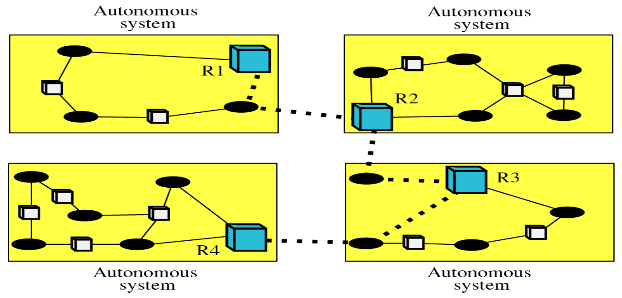 이 한 AS 내에서 동작하는 프로토콜을 Interior routing이라고 하고, AS 내에 있는 컴퓨터가 다른 AS에 있는 컴퓨터와 통신할 때 사용하는 프로토콜은 Exterior routing이라고 한다.