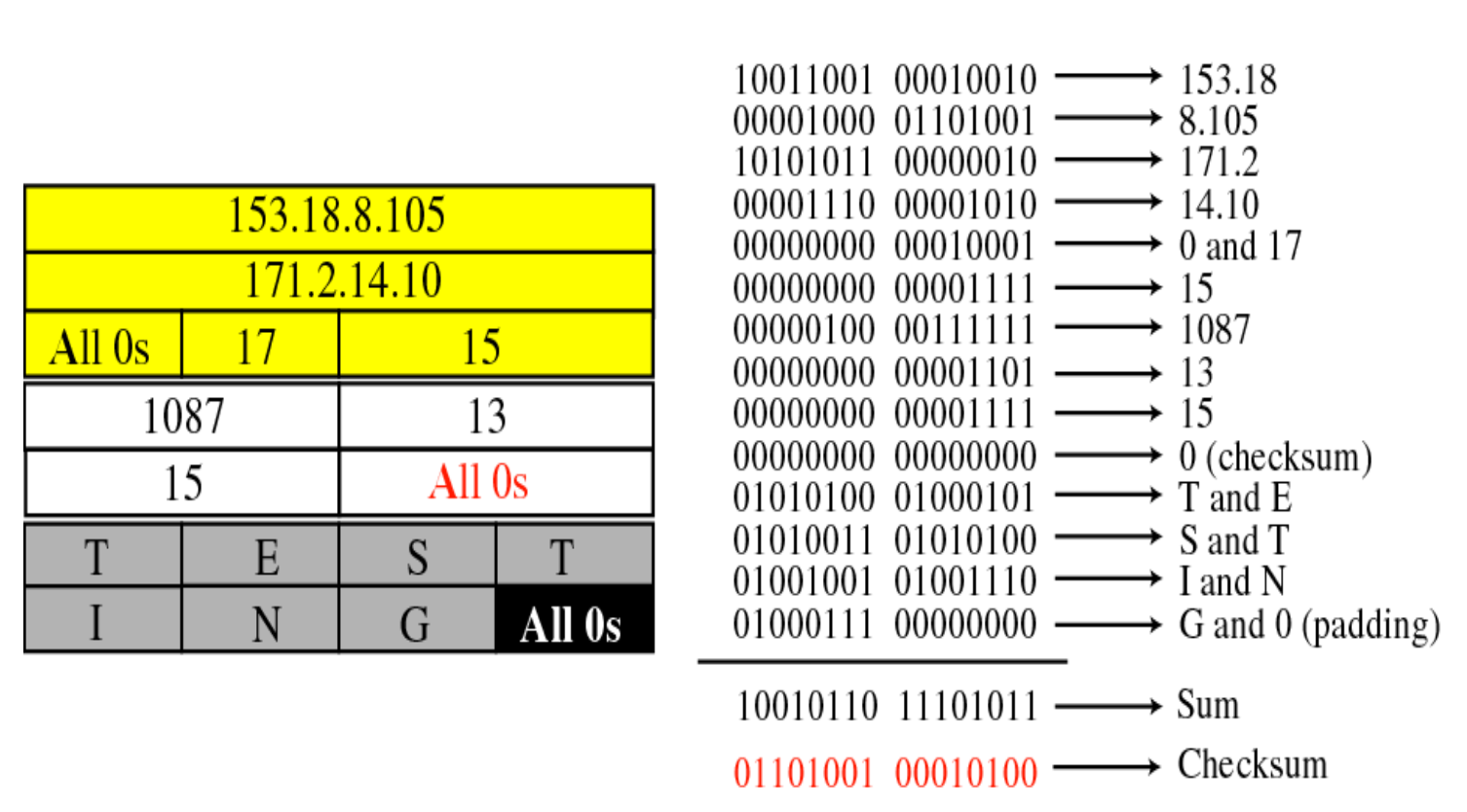 여기서 TL 필드가 Pseudo header에도 있고, Segment Header에도 있다. 이 필드들에 있는 값은 같지만, Pseudo header는 IP 패킷의 헤더를 보고 이 UDP Segment의 길이를 적고, Segment header의 TL은 자기 자신(Segment header)을 보고 길이를 적게 된다.