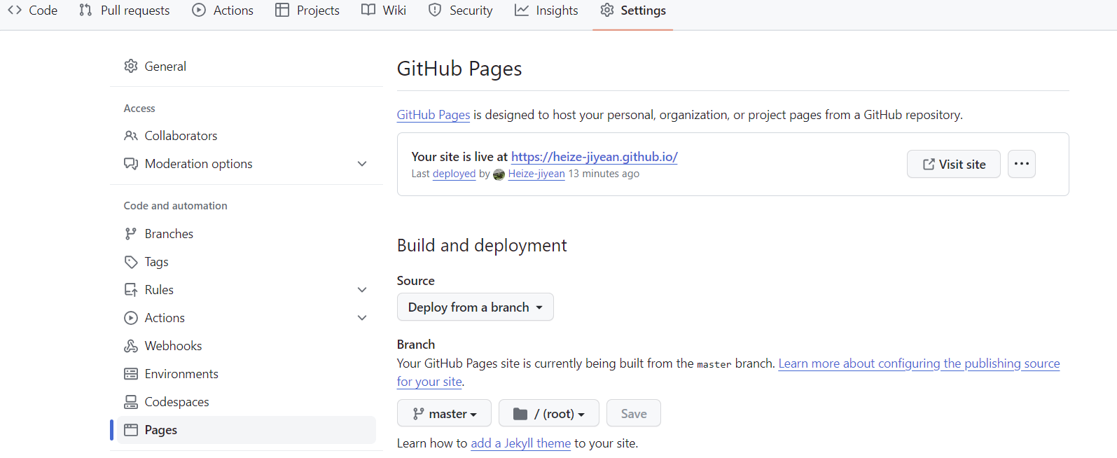Github pages 아래 나의 유저네임으로 된 깃허브 . io 주소가 있다.
