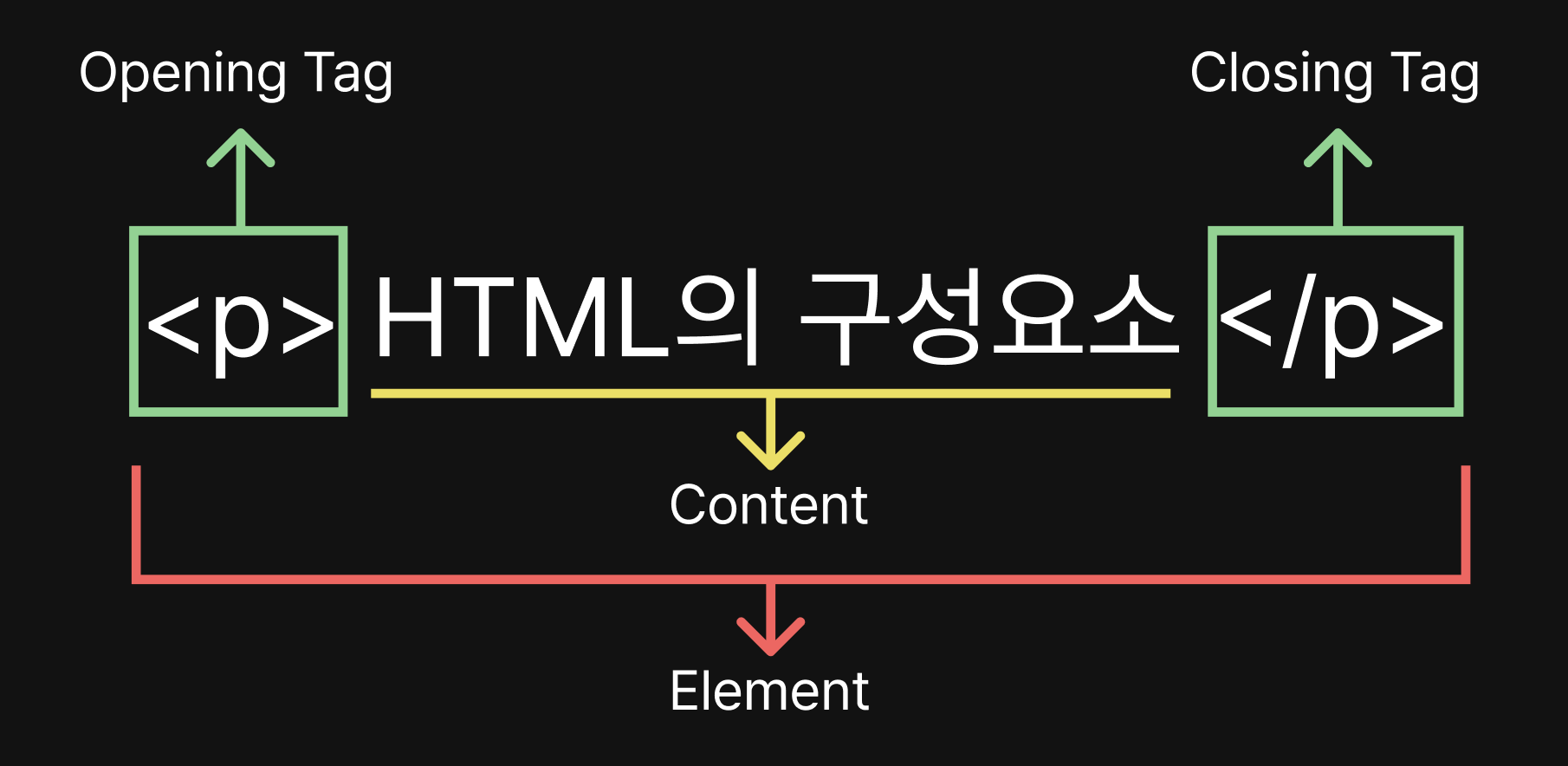 위 예시에서는 Opening Tag (시작 태그)와 Closing Tag(종료 태그)가 있다. 각각 요소의 시작과 끝을 나타내는 역할이다. <br>, <hr> 과 같이 Closing Tag가 따로 존재하지 않는 경우도 있다.