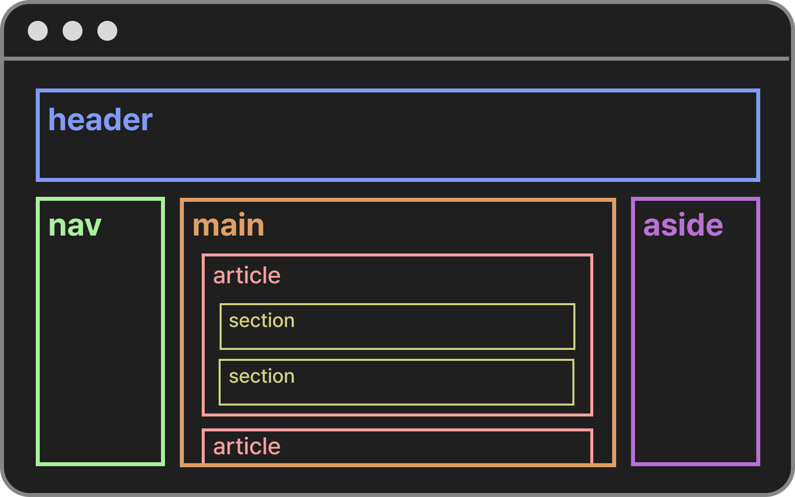 이렇게 표현을 할 수 있고, 이런 시맨틱 태그들을 잘 이용하면 훨씬 코드의 가독성이 높아진다. 자주 사용하는 시맨틱 태그들만 몇 가지 간략하게 소개해보려고 한다.