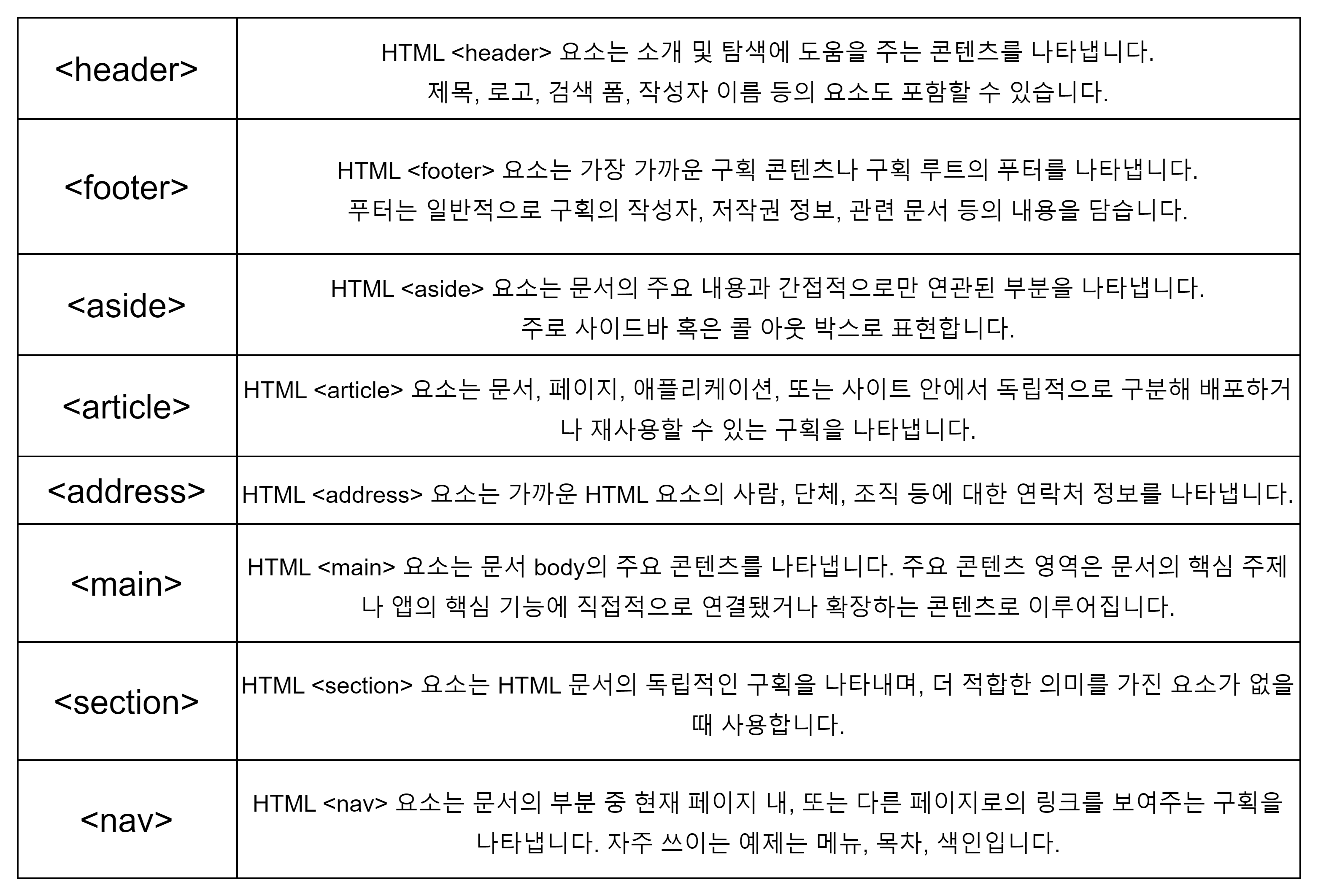 <div>, <span> - 내용에 대한 정보 X<form>, <article>, <table> - 어떤 내용을 포함할지에 대한 정보를 담고 있음
