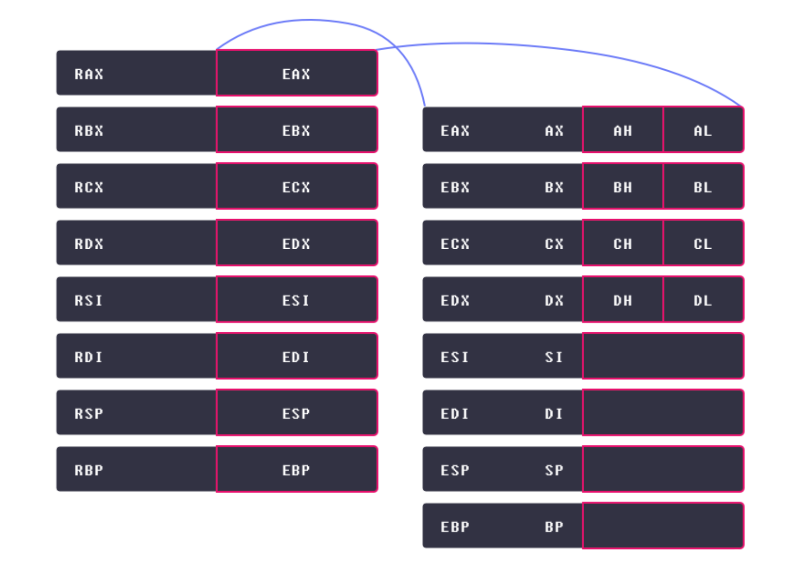 ex) rax = 0x0123456789abcdef eax = 0x89abcdef ax = 0xcdef ah = 0xcd al = 0xef