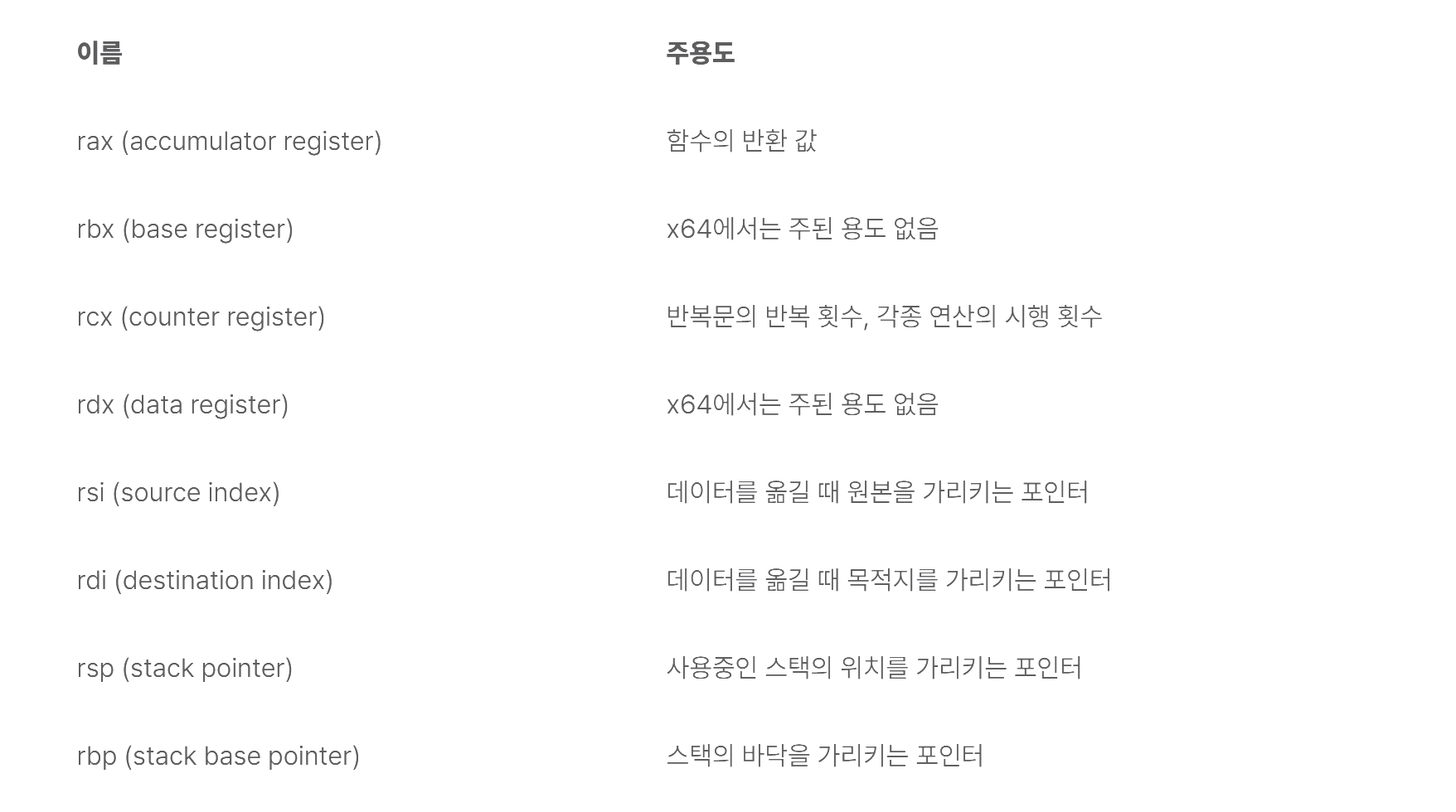 적어도 rsp, rbp, rsi, rdi는 외워두는 것이 추후 리버싱을 할 때 도움이 될 것입니다.
