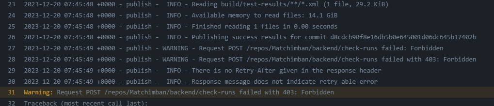 Warning: Request POST /repos/Matchimban/backend/check-runs failed with 403: Forbidden