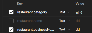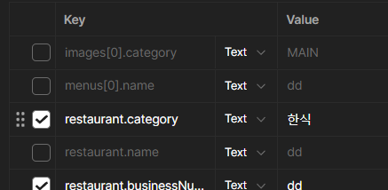 다음처럼 menu와 image에 대한 정보는 넣지 않았고, @NotEmpty인 name을 제외했다.