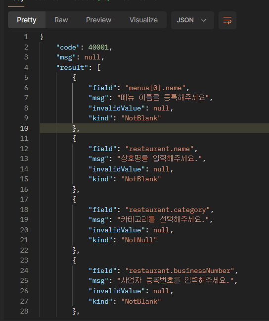 저번에 새로 발생하는 예외에 대해 처리해봤다. RestaurantRegisterRequest 안의 RestaurantCreateRequest, RestaurantImageCreateRequest, MenuCreateRequest 검증이 제대로 작동하는지 확인하기 위해 다음과 같이 일부러 값을 하나 틀려봤다.