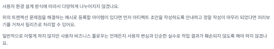 핵심은 사용자 비즈니스 플로우는 사용자의 변심과 단순한 실수로 작업 결과는 훼손되지 않아야 한다는 것이었다.
