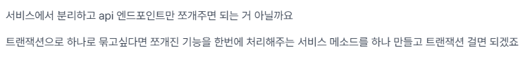 "여러 요청을 하나의 트랜잭션으로 묶는 것은 굉장히 어려운 일이라고 알고 있다. 만약 하나의 요청에 하나의 기능을 넣고 싶다면 어느정도 트랜잭션을 포기해야 할 것이며, 트랜잭션을 보완하는 다른 방안을 생각해야 할 것 같다."