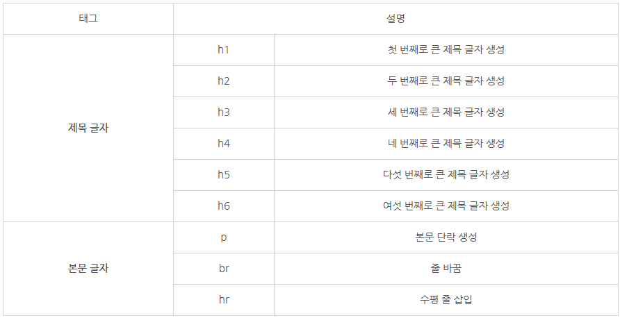 → h1이 가장 큰 제목 태그, h6이 가장 작은 제목 태그