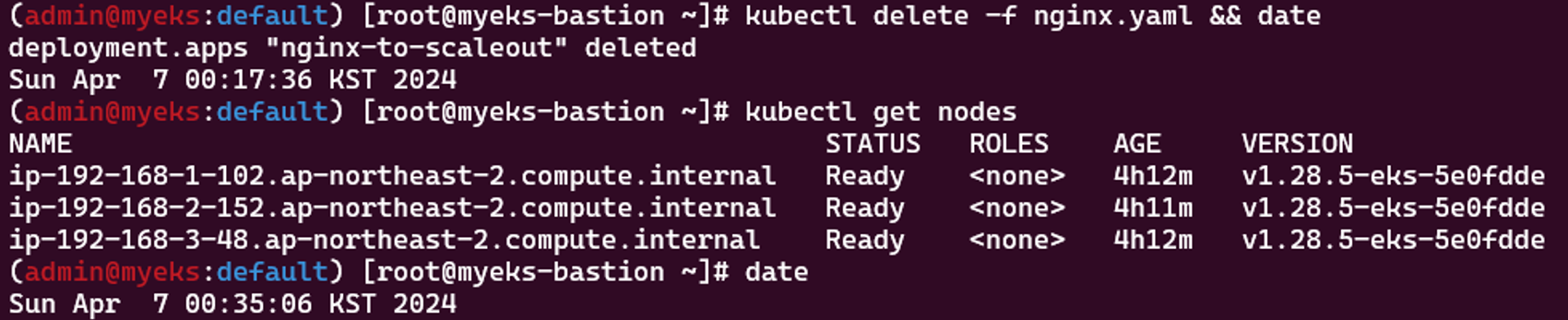 노드가 스케일아웃되는 것은 확인했으니, 스케일인되는 것도 확인해 봤다.