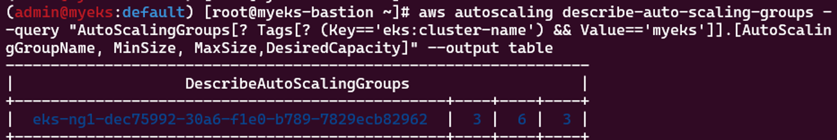 aws autoscaling describe-auto-scaling-groups --query "AutoScalingGroups[? Tags[? (Key=='eks:cluster-name') && Value=='myeks']].[AutoScalingGroupName, MinSize, MaxSize,DesiredCapacity]" --output table