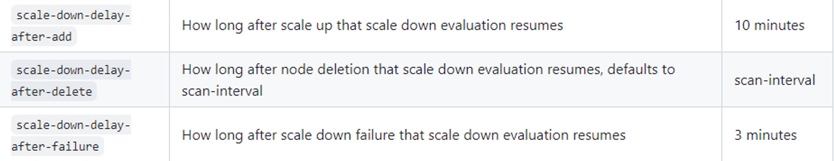 scan-interval 시각은 기본 10초로, scale-down-delay-after-delete는 10초마다 노드 삭제 이후 체크하게 된다. 또한, scale-down-delay-after-add로 스케일아웃된 이후로 10분 간격으로 스케일인 여부를 확인한다. scale-down-delay-after-failure는 노드 삭제가 실패하면 3분마다 다시 체크한다.
