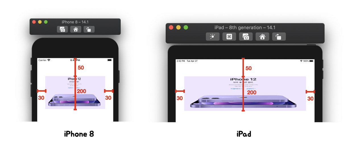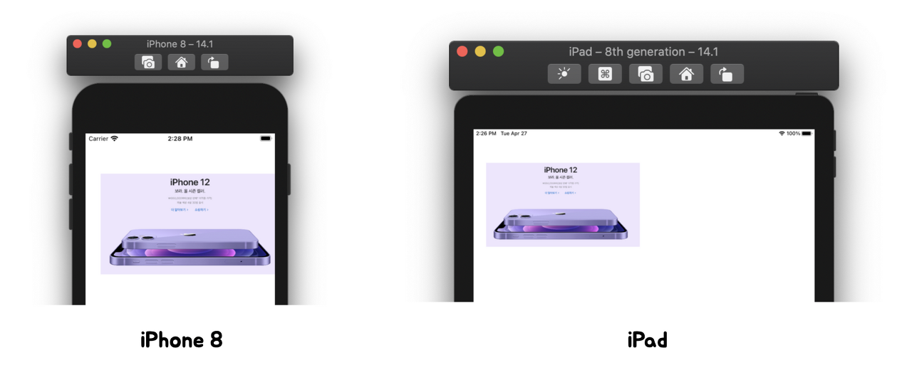 근데 만약, 우리가 Frame을 잡을 때 기준으로 한 12Pro Max와 해상도가 다른 iPhone8, iPad화면에서는 어떻게 보일까??