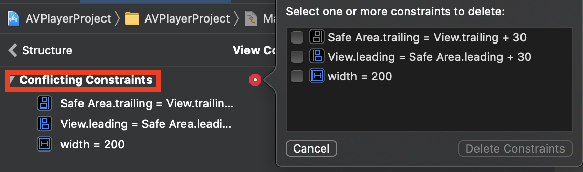 Constraints가 충돌했다며, leading/trailing/width 중 하나를 지우라는 에러가 뜸!
