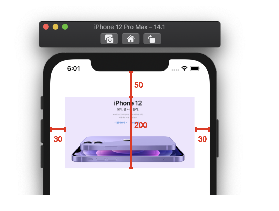 기준 객체(safe area)로부터 왼쪽으로 30, 오른쪽으로 30, 위로 50만큼의 margin이 있으며, height가 200이란 제약 조건이 있는 ImageView를 그리는 것!