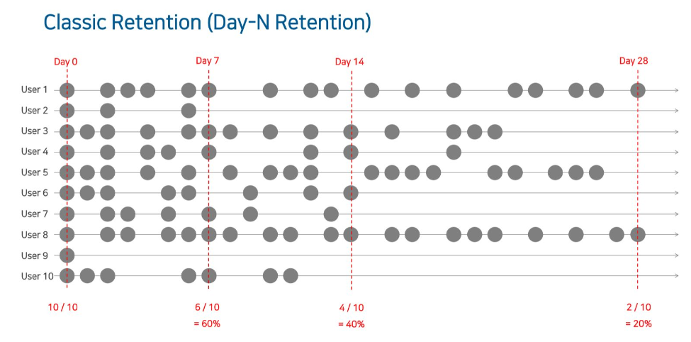N-Day Retention = Day N에 서비스를 이용한 사람 / Day 0에 처음 서비스를 이용한 사람