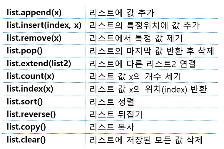 ✔️<<수정> a = [1, 2, 3] a[2] = 4 print(a) #[1,2,4] ✔️<<삭제> del 함수 a = [1, 2, 3, 4, 5] b = [1, 2, 3, 4, 5] del(a[1]) # 리스트 a의 1번 index 삭제 del(b[:4]) # 리스트 b의 0번 index부터 3번 index까지 삭제 print(a) print(b) #[1, 3, 4, 5][5]다]메서드(method)