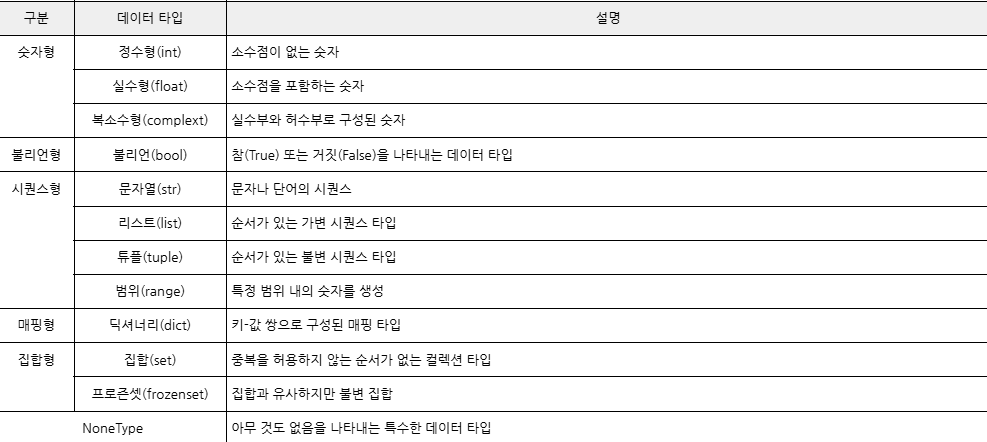 -int(integer): 정수 -str(string): 문자열, "~" -float: 실수형
