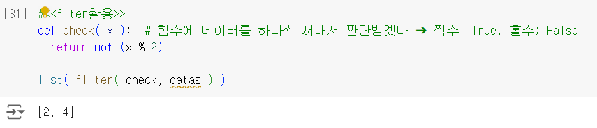 filter( 콜백함수[*Ture 리턴], 데이터 )참(True) 데이터만 추출 [=필터링 한다.]