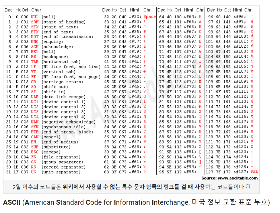 아스키코드: 컴퓨터에게 알파벳이나 특수문자와 같은 문자를 전달하기 위해 만들어진 코드.