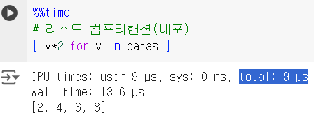 %%time : 함수 수행시간 및 효율성 확인 가능