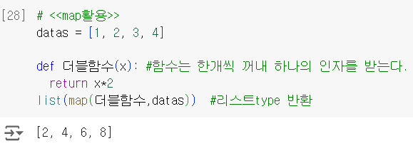 map(콜백함수, 이터러블data): 자료구조(주로 list)상 데이터를 하나씩 꺼내어 작업수행 ➔ 다시 리스트로 data값 반환