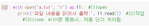 with문: 코드간결 & 자동 닫기 처리원본 as 별칭 (ex. 별칭 대변하기 어려운 상황)