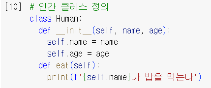 -인스턴스 변수:self.변수명= 값⤷ (* 인스턴스: 클래스란 설계도를 바탕으로 메모리에 생성된 객체)- 특징