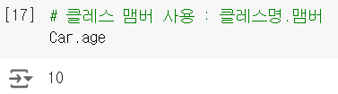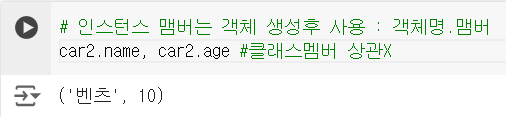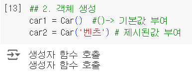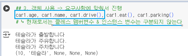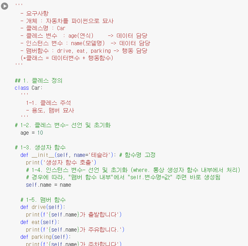 class에 파이썬으로 작성(묘사)된 코드 ➜ 메모리에 로드되어야 작동 car = Car() #⇒ 변수명car/ 클래스명Car